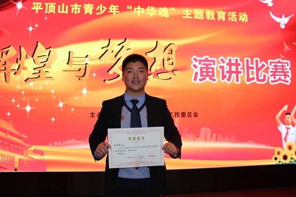 最后,经过评委公平公正的评判,我校尚浩楠同学荣获2017年平顶山市“中华魂-辉煌与梦想”主题演讲比赛中学组一等奖!
