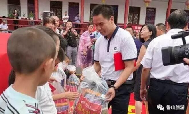 在活动现场,平顶山市旅游局局长张风岭、鲁山县旅游局局长陈立新、四棵树乡人民政府乡长段雪枫、平顶山市旅游局驻沃沟村第一书记张雁斌、天瑞旅游集团股份有限公司副总经理徐大川、河南省自驾游护照发行中心总经理张广辉、凤凰网河南旅游频道总监郭颖颖及昆明航空公司郑州营业部吴长壁和坤泰农业营销总监贾庆吾等爱心企业为贫困学生发放爱心大礼包;并为贫困户发放电风扇、大米、食用油及爱心食品、衣物等生活急需的爱心物资。