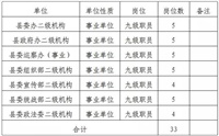 为进一步加强干部队伍建设,提升工作效能,根据工作需要,按照《事业单位人事管理条例》规定,决定在全县范围公开选聘事业单位九级职员33名。现公告如下:一、选聘单位与岗位二、选聘范围及条件报考者除应当具备《事业单位人事管理条例》《事业单位岗位设置管理试行办法》所规定的基本条件外,还必须具备下列资格:1