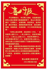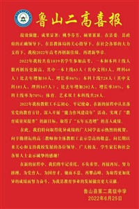 不忘师者初心,牢记育人使命。在县委县政府和上级主管部门的直接领导下,鲁山三高切实践行“立德树人、全面发展、低进优出、追求卓越”的办学理念,狠抓教育教学改革,强化德育管理,风雨同舟,共克时艰,2022年高考再创佳绩!“甘将心血化时雨,润出桃花一片红。”全校报考人数523人,一本上线40人,较去年净