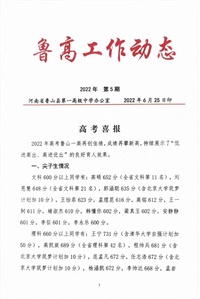 2022年高考鲁山一高再创佳绩,成绩再攀新高,持续展示了“低进高出、高进优出”的良好育人效果。一、尖子生情况文科600分以上同学有:高硕652分(全省文科第11名),刘恩慧648分(全省文科第21名),郭涵聪635分(含北京大学筑梦计划加10分),王怡菲623分,孟煜昆616分,高铭612分,王